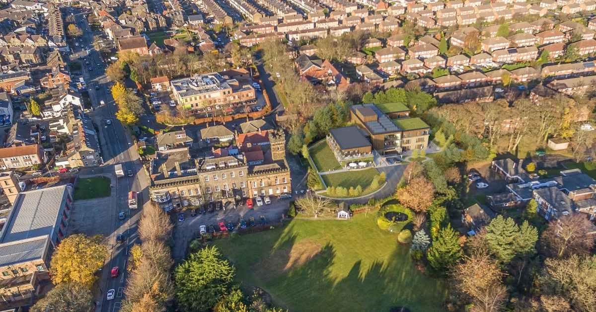 An aerial view showing Grove House opposite the fire station on Skipton Road.