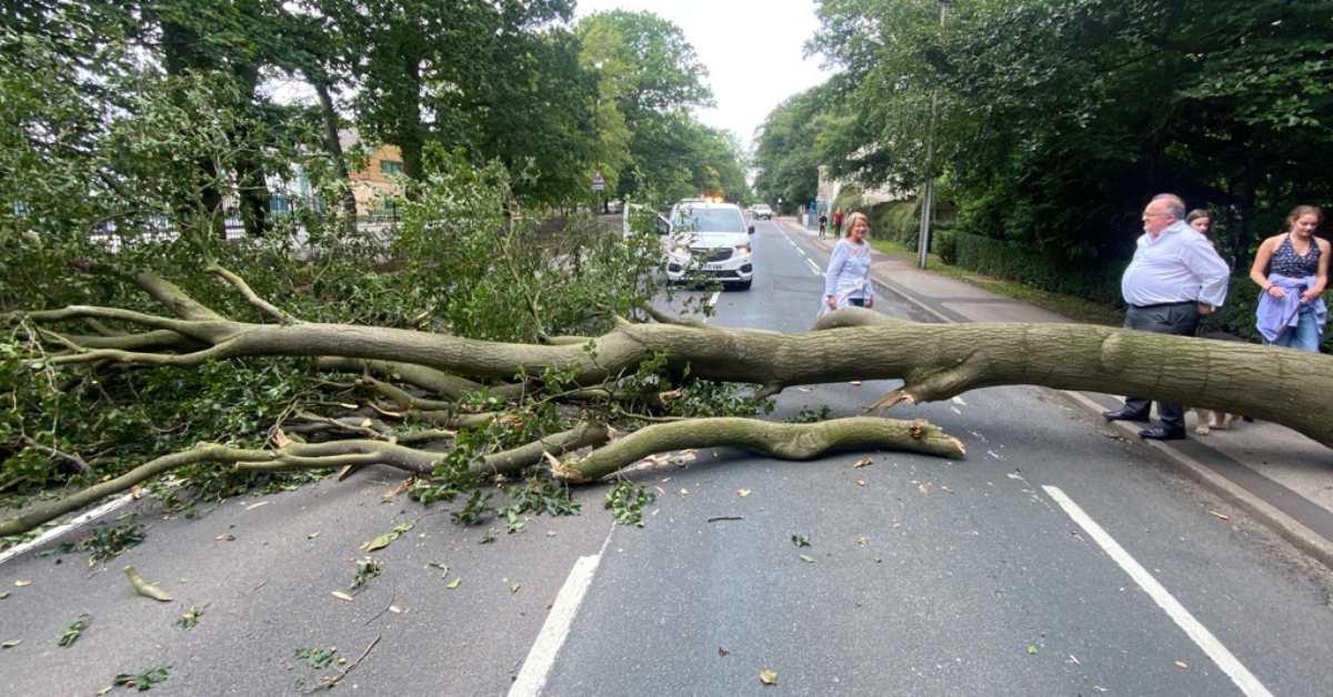 The 50-foot beech tree crashed across Oatlands Drive at about 1pm, glancing the wall of St Aidan's Church of England High School opposite.