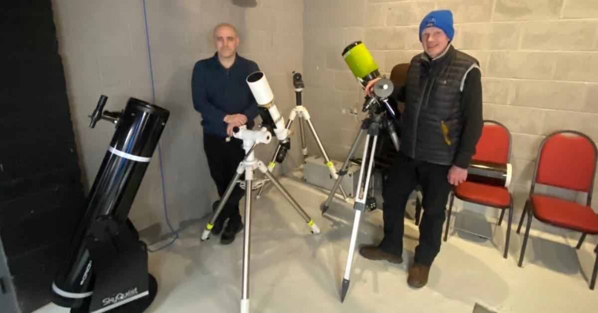 Martin Whipp (left) and Chris Higgins play with the telescopes.