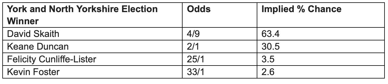Labour's David Skaith is leading the race to be named mayor of York and North Yorkshire, according to Oddschecker.