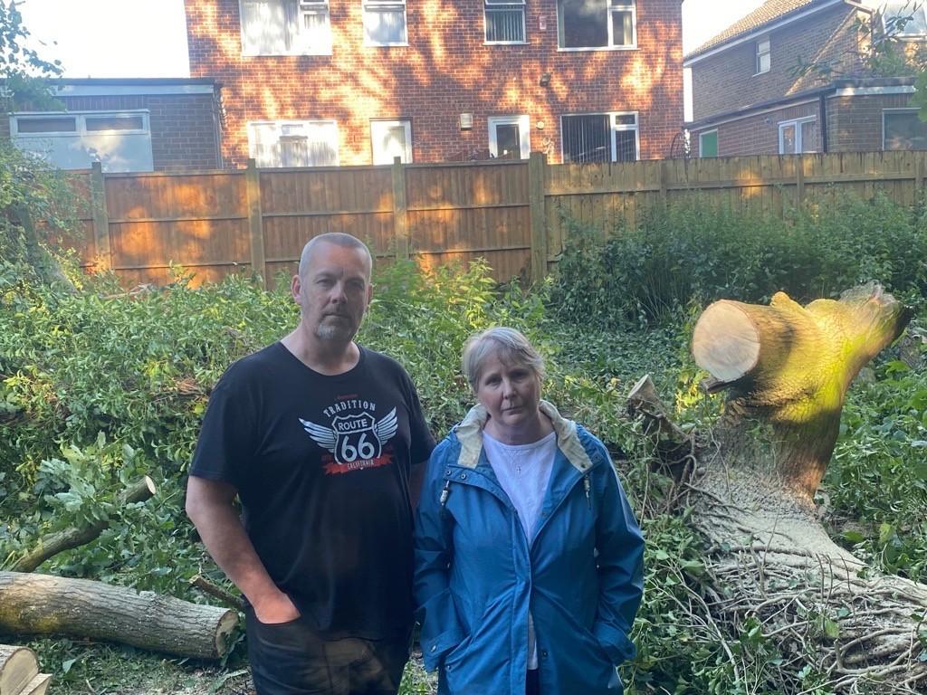 Keith and Christine Amour besides the fallen trunk, with their homes in the background.