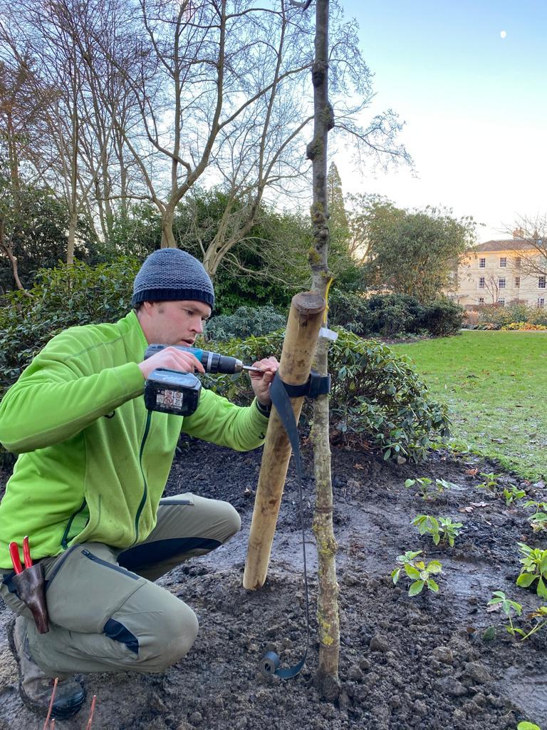 You may need to add a tree guard or spiral if you think there is a chance that the stems could get nibbled. Very small trees shouldn’t need staking and will grow better without one. Larger trees that may be top heavy will probably need to be staked to support them until they get established, usually this takes around 2 years. The stake is best put in at a 45% angle and the tree tied with a rubber or jute tie which can be screwed or nailed to the stake to keep it in place. Don’t forget to check the stakes and ties regularly and loosen as the tree grows.