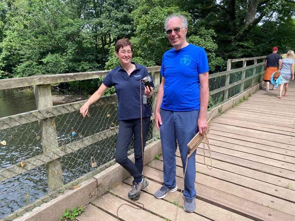 Charlotte Simons and David Clayden hold a test kit above the River Nidd.