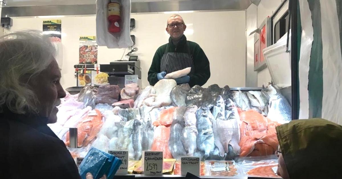 Fishmonger Martin Carrick out early this morning serving regular customers Darren and Janet Ratcliffe.